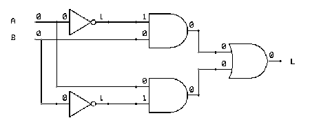 The XOR ( exclusive-OR ) gate acts in the same way as the logical “either/or.” The output is “true” if either, but not both, of the inputs are “true.” The output is “false” if both inputs are “false” or if both inputs are “true.” Another way of looking at this circuit is to observe that the output is 1 if the inputs are different, but 0 if the inputs are the same.