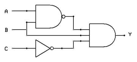 A logic diagram uses the pictoral description of logic gates in combination to represent a logic expression. An example below shows a logic diagram with three inputs (A, B, and C) and one output (Y). The interpretation of this will become clear in the following sections.